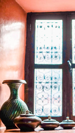 Cette chambre double se trouve au premier étage du Riad et abrite un incroyable muqarna en bois (une arche ornementale complexe), un chef-d'œuvre rare que nous avons découvert dans un magasin d'antiquités local, il y a quelques années. Il encadre magnifiquement le lit et ajoute une touche merveilleuse à la pièce. Le petit coin salon à l'extérieur offre l’endroit idéal pour un moment contemplatif de tranquillité.